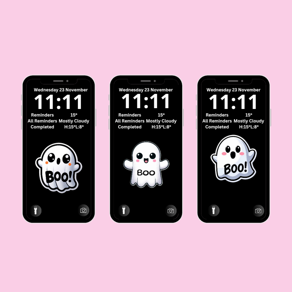 Description:Bring a touch of spooky cuteness to your device with this collection of charming ghost wallpapers! Each wallpaper features an adorable ghost character playfully exclaiming "Boo!" against a sleek black background. The soft pastel accents and rosy cheeks add a delightful charm, making these wallpapers perfect for anyone who loves a blend of Halloween fun and kawaii aesthetics. Perfect for mobile devices, these high-resolution wallpapers will give your screen a cute yet spooky vibe. Ideal for the Halloween season or for anyone who loves cute and spooky designs year-round!